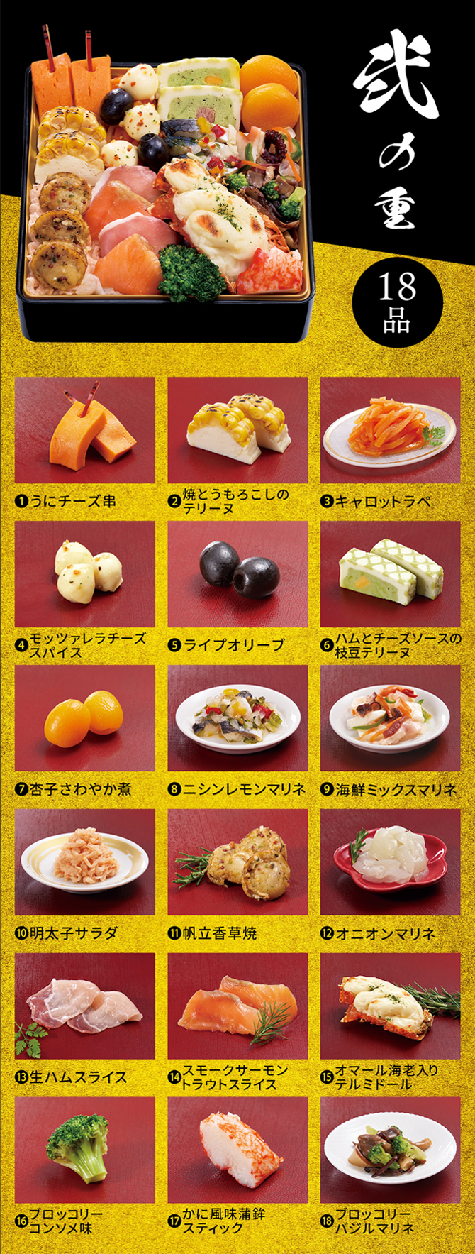 「うにチーズ串」「ニシンレモンマリネ」「オマール海老入りテルミドール」など魚介をメインとした弐の重。